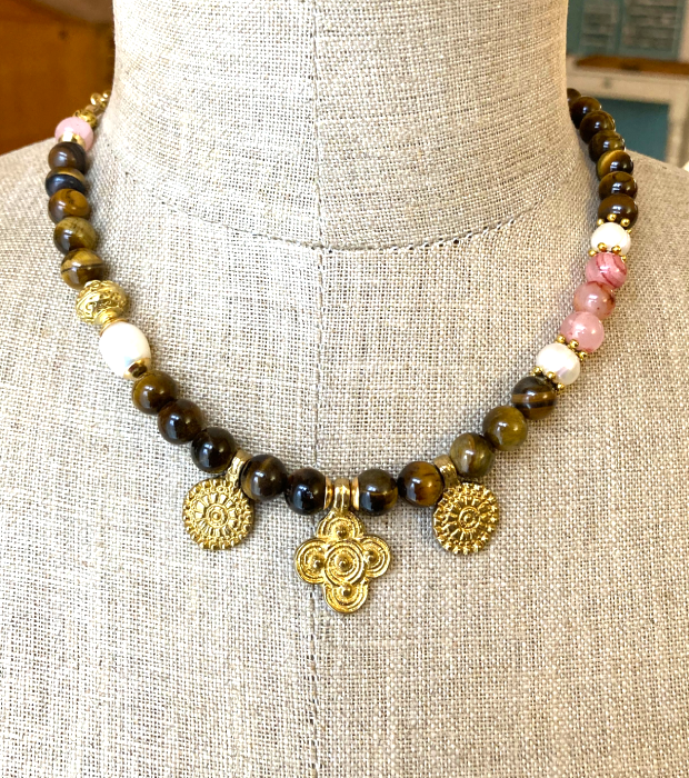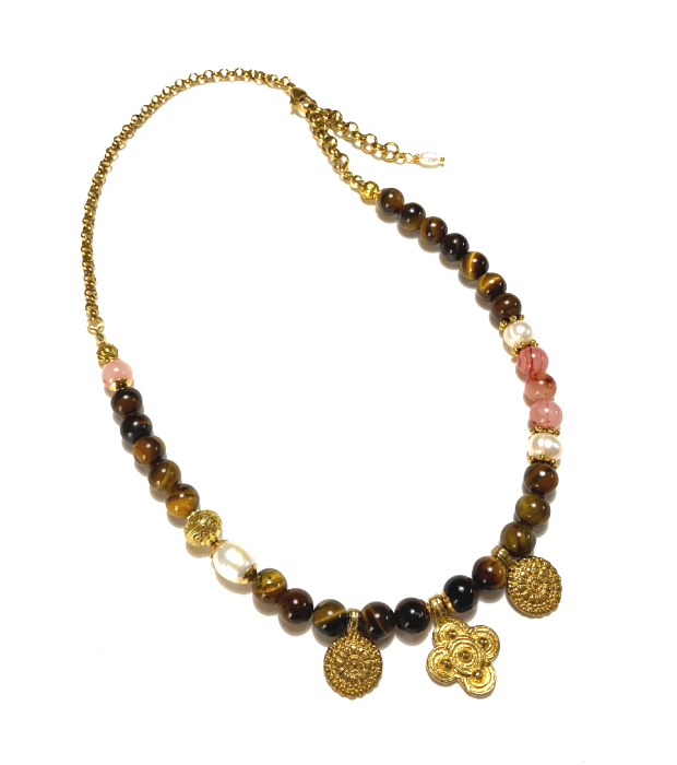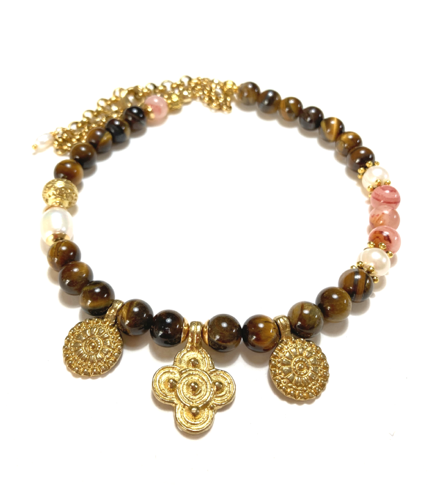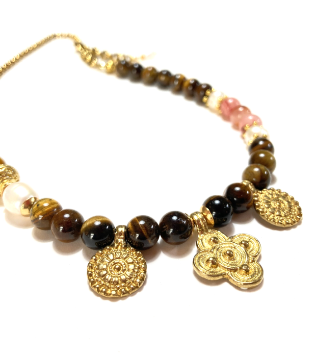 Deze Bruin met Roze Tijgeroog Ketting met Bedels in goud is heel fijn voor jou als je verlangt naar meer balans tussen kracht en zachtheid. Als je soms te veel in je hoofd zit of jezelf wegcijfert, helpt deze ketting je om weer te landen in je eigen energie: stevig, warm en in vertrouwen.