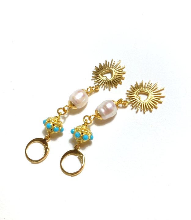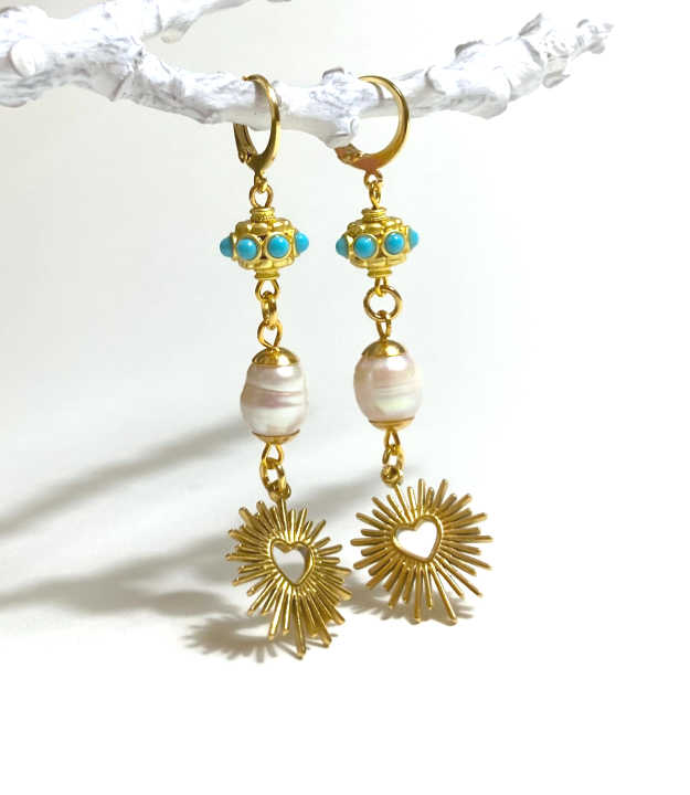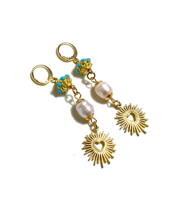 Deze handgemaakte oorbellen combineren de tijdloze elegantie van zoetwaterparels met de levendige energie van turquoise resin. De vergulde RVS bedels en het speelse Stralend Hart geven een subtiele boho-touch, terwijl de 14K vergulde oorhaakjes zorgen voor een luchtige, losse, maar tegelijk stijlvolle en verfijnde uitstraling. Perfect om je look een vleugje frisheid én karakter te geven – zowel voor dagelijks gebruik als bij speciale gelegenheden.