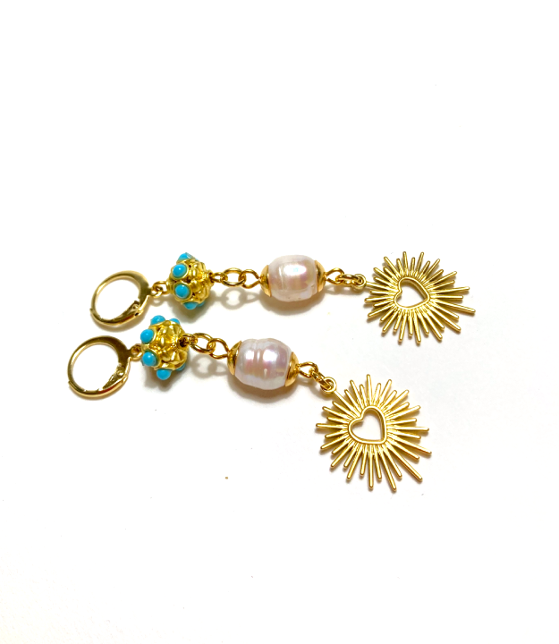 Gouden oorbellen met Stralend Hart bedels, Zoetwaterparels en Turquoise resin detail