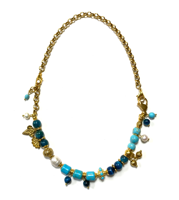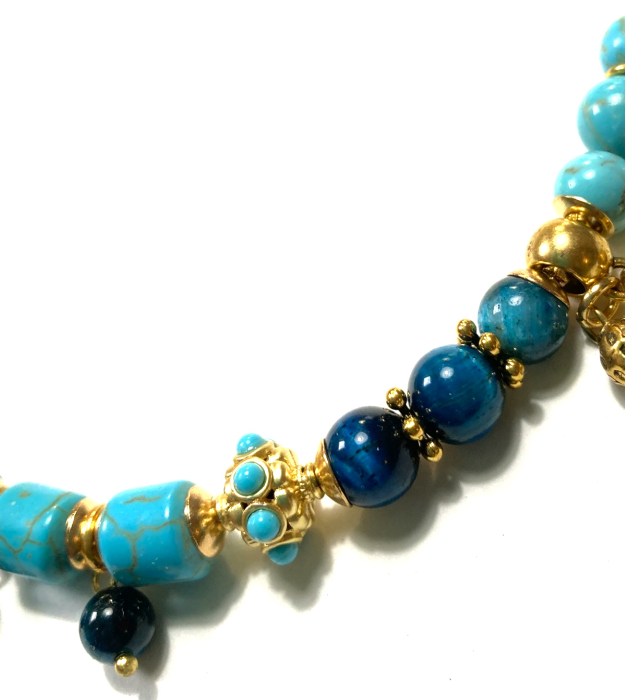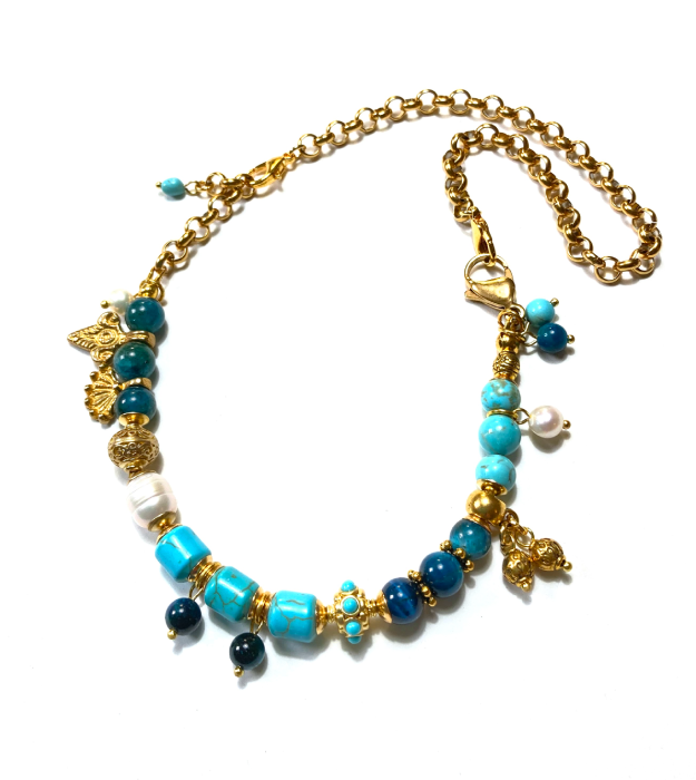 | Materialen | halfedelstenen, zoetwaterparels, apatiet, blauwe halfedelstenen, tijgeroog, turquoise howlite, goldplated rvs, messing bedels |