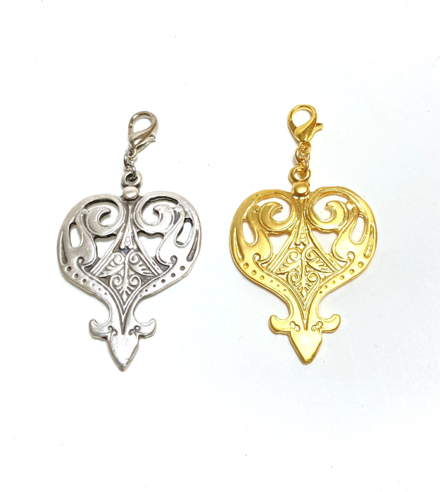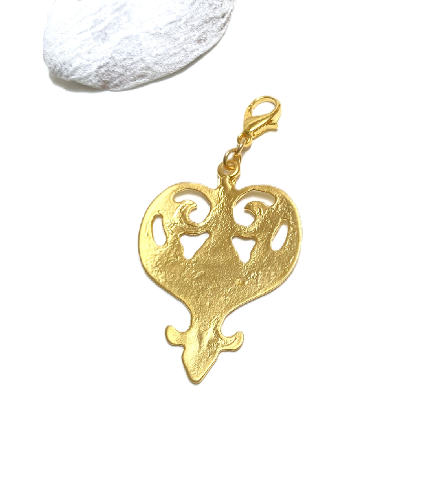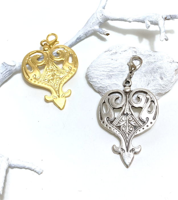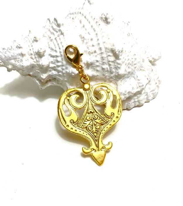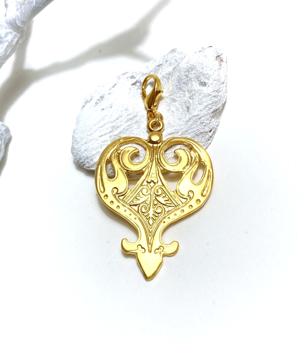 Geef je favoriete kettingen een uniek accent met deze prachtige, vergulde verwisselbare hanger van 6,6 cm lang. De hanger is verguld (mat) en komt uit Turkije. Het is een ornament met een prachtige hartvorm in etnische stijl. Ik heb er een verguld RVS karabijnslotje aan bevestigd.
