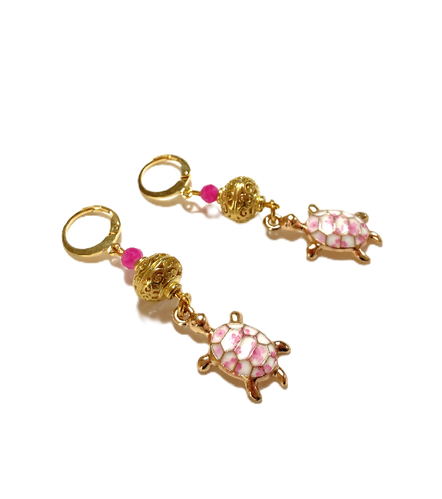 | Materialen | 14K vergulde RVS huggie hoops, turquoise geëmailleerde schildpad bedels, roze toermalijn kralen, ruw messing opengewerkte filigraan kralen |